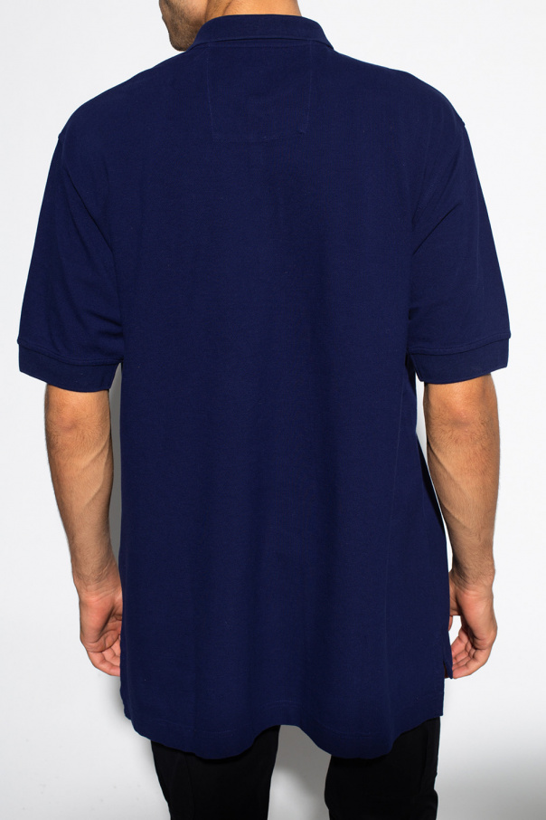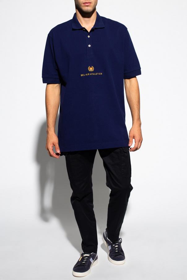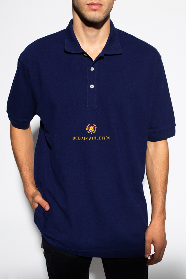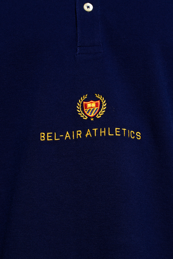 Navy blue polo shirt from Bel-Air Athletics. Crafted from cotton, this style features short sleeves, a button placket and an embroidered logo.