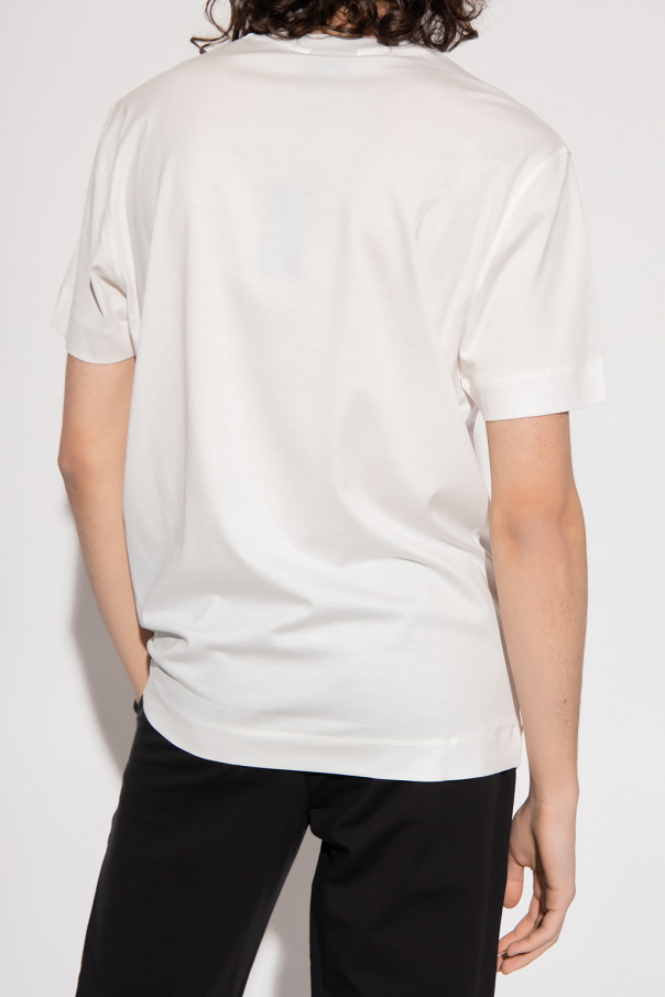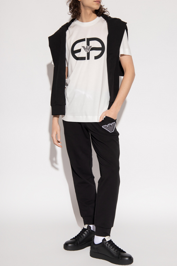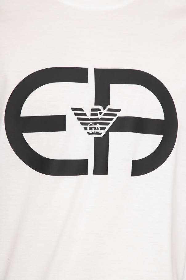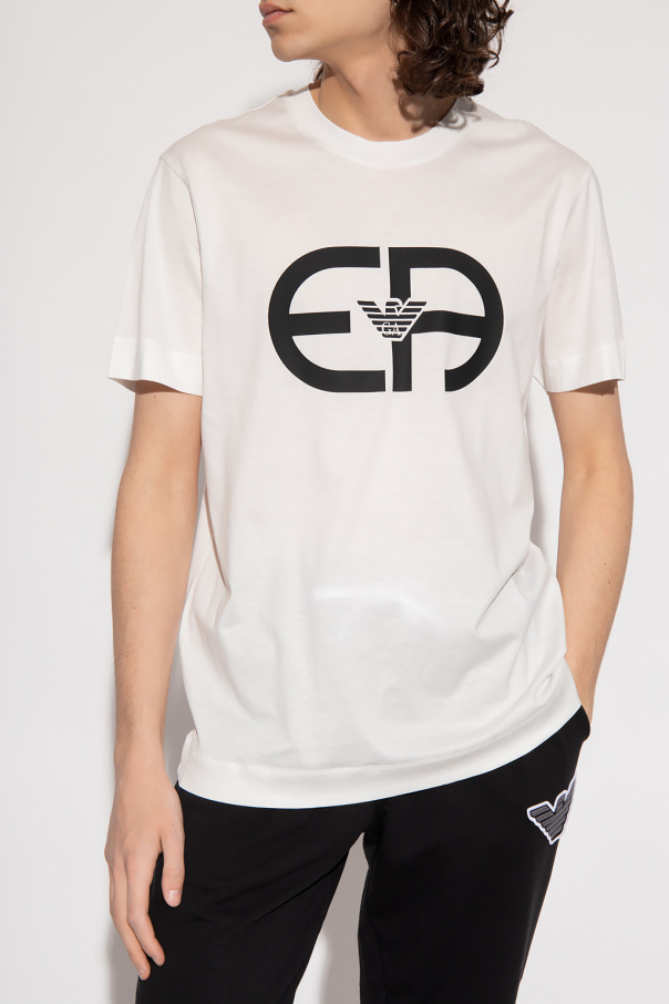 White T-shirt from Emporio Armani. This short sleeve design features a ribbed crew neck and black logo print.
