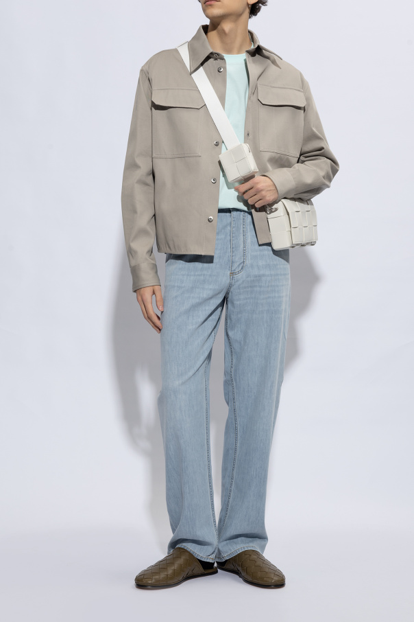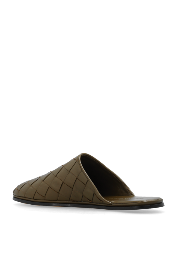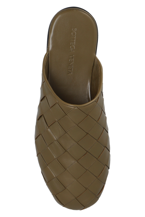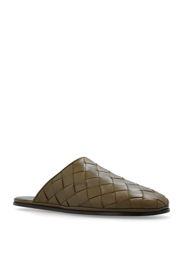 Greenish-brown ‘Sunday’ slides from Bottega Veneta. Made of leather, this model is embellished with the brand\'s signature ‘Intrecciato’ weave and features a beige leather sole.