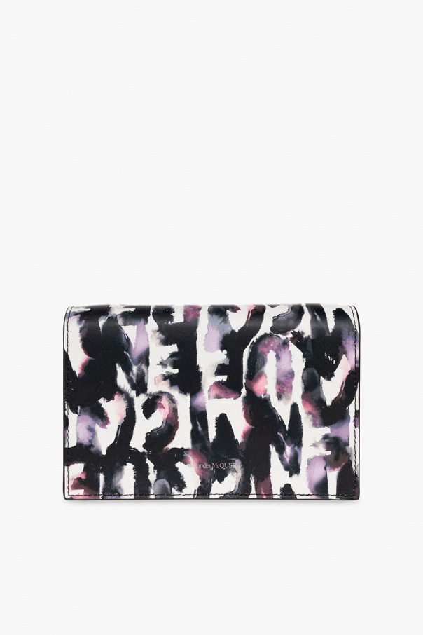 White, black and pink ‘Skull Small’ shoulder bag from Alexander McQueen. Crafted from calf leather, this design fastens with a snap and showcases the brand\'s ‘McQueen Graffiti’ logo print with a blurred effect, its signature skull hardware accentuated with glossy crystals on the front, a logo print at the back, a chain shoulder strap, silver-tone metal elements and one internal compartment with a card slot.
