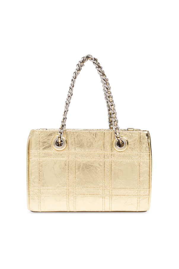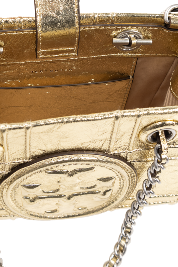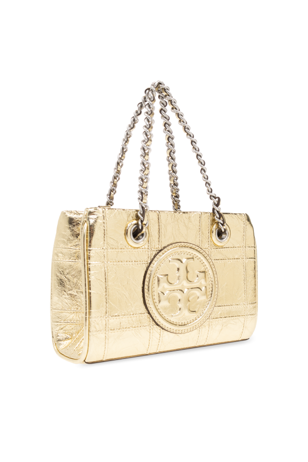 Gold-tone ‘Fleming’ shoulder bag from Tory Burch. Made of lamb leather, this design secures with a magnetic snap and showcases a logo application, a chain and leather shoulder strap, silver-tone metal hardware and one internal compartment.