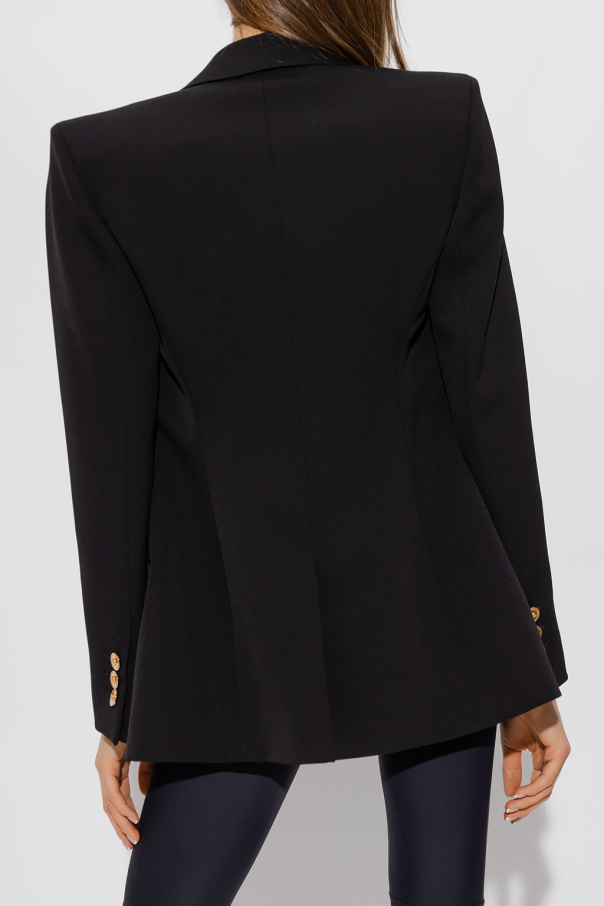 Black blazer from Versace. Crafted from wool, this design features button fastenings, padded shoulders, peak lapels, three pockets, long sleeves and single rear vent.