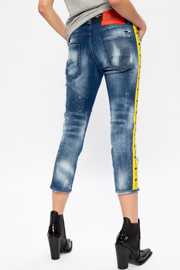 Blue \'Cool Girl Cropped Jean\' jeans from Dsquared2. Flaunting logo appliqués and decorative paint splatter effects, this pair falls down with tapered legs with raw edges and employs button closing and classic five pockets.