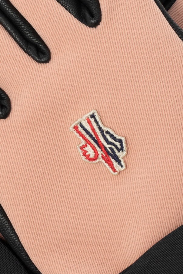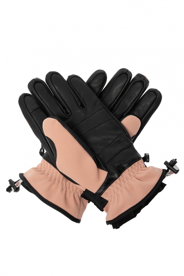 Pink and black gloves from Moncler. Trimmed with lamb leather, this design features a sewn-on logo in white, red and blue, drawstrings, adjustable buckle strap and velcro fastening.