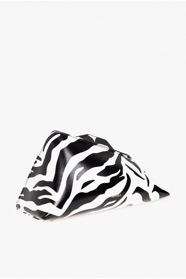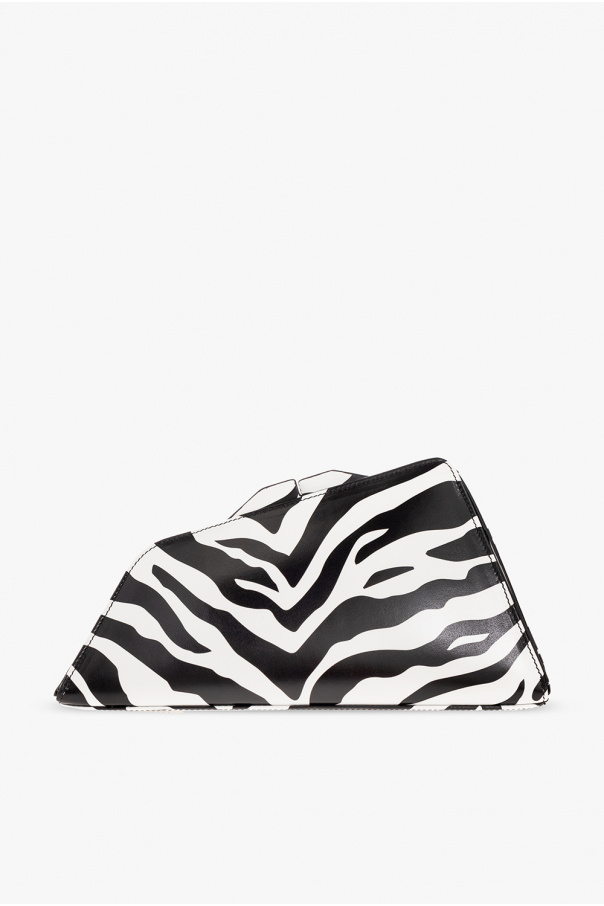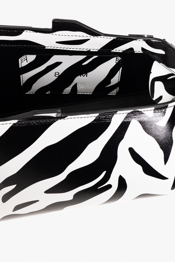White and black ‘8.30PM’ handbag from The Attico. Crafted from calf leather with an animal motif, this design secures with a magnetic closure and showcases a silver-tone logo printed on the front, silver-tone metal hardware and one internal compartment with a card slot.