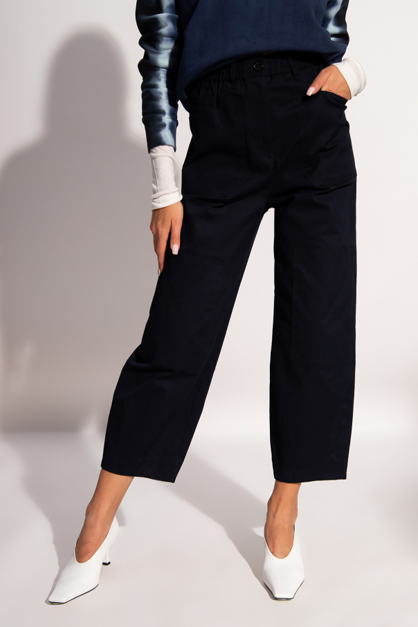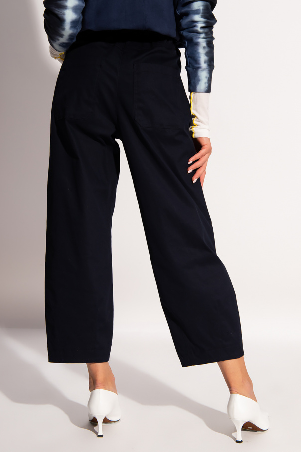 Navy blue trousers from PS Paul Smith. Crafted from cotton with wide legs that taper towards the ankles, this pair features a zip fly with a button, an elasticated waistband, distinctive stitching details and classic five jean pockets.
