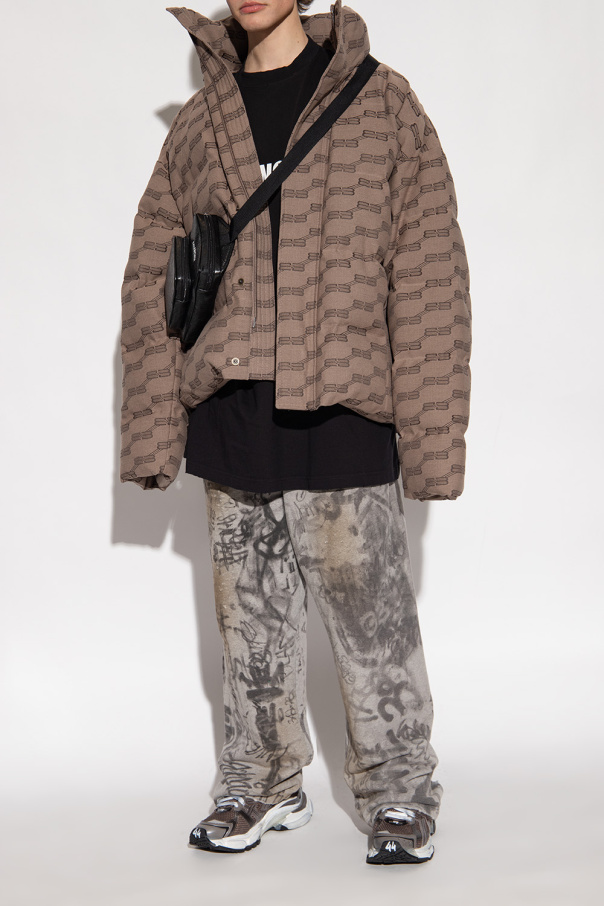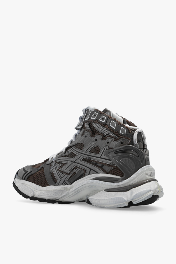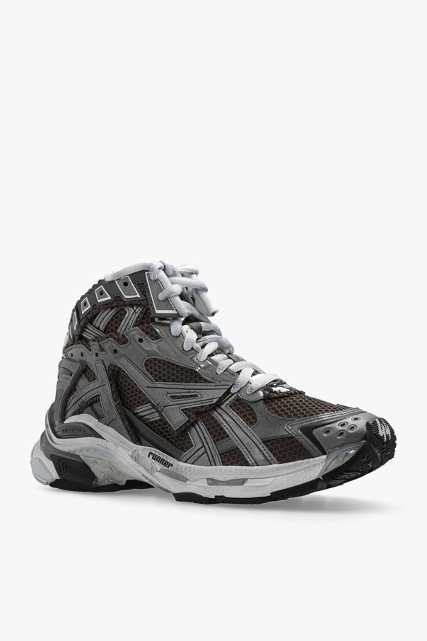 Brown, grey and white ‘Runner’ high-top sneakers from Balenciaga. Made of fabric and trimmed with mesh and rubber, this lace-up model sits on a white and black rubber sole with transparent inserts and features a vintage effect and a printed logo.