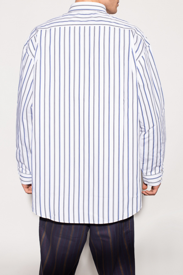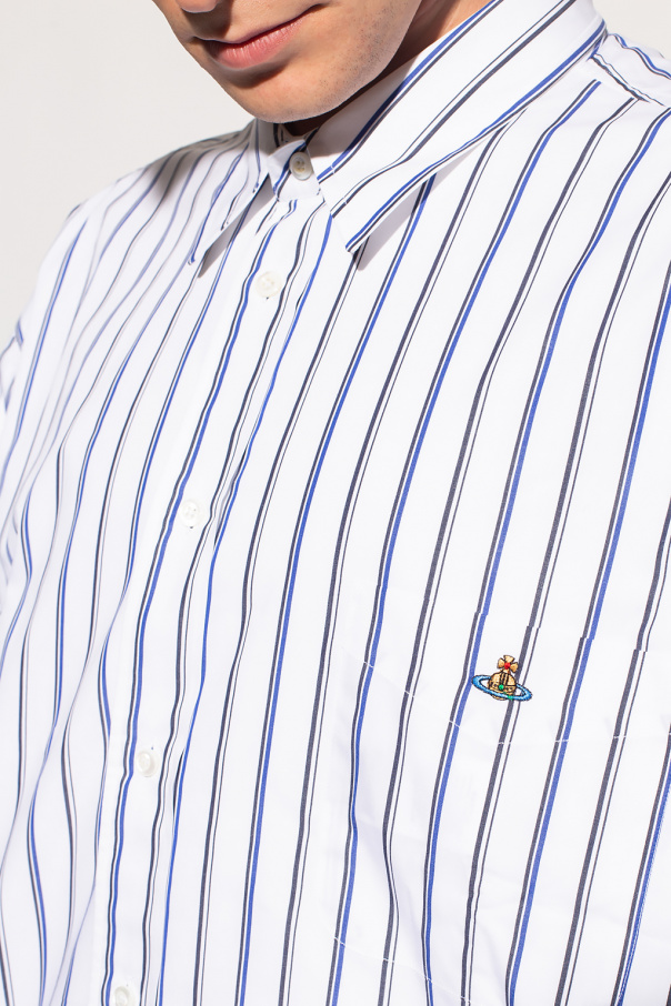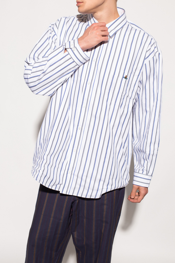 White shirt from Vivienne Westwood. Crafted from organic cotton, this oversize design features a multicolored logo patch, navy stripes, button fastenings and long sleeves with banded cuffs.