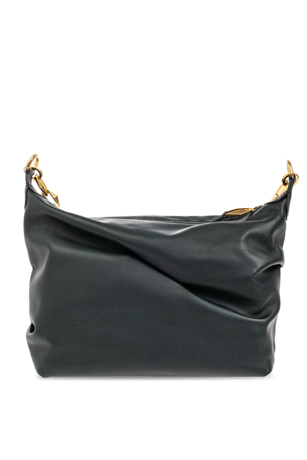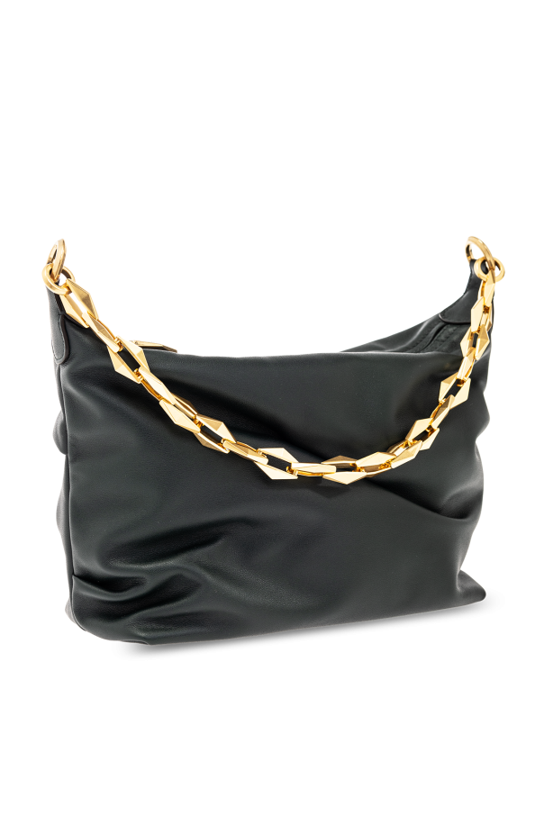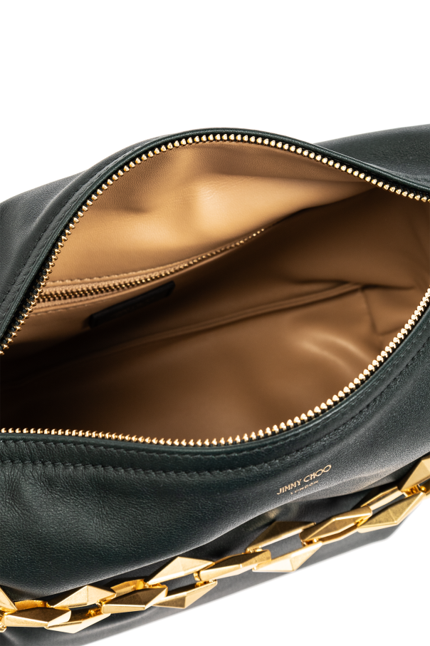 Dark green ‘Diamond Soft Small’ shoulder bag from Jimmy Choo. Made of leather, this design features a zip fastening, embossed logo, chain with decorative diamond-shaped links, detachable shoulder strap, gold-tone metal hardware and one internal compartment with one zip pocket.