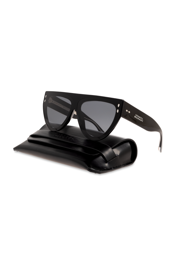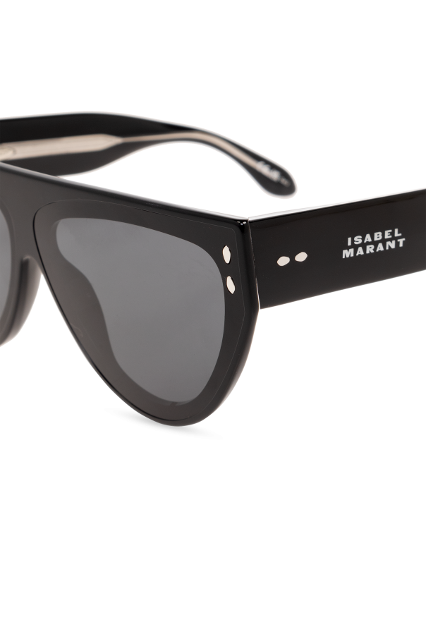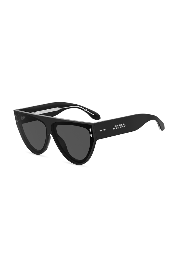 Discover the epitome of elegance and modern flair with Isabel Marant\'s Oversized Sunglasses. Meticulously crafted from high-gloss, 100% acetate, these sunglasses boast large, oval lenses with slightly angular edges, creating an enchanting \"oversize\" silhouette that is highly sought after in women\'s accessories. The allure of these sunglasses is further enhanced by the distinctive black hue, complemented by subtle, metallic accents at the corners of the frames, and iconic round rivets or decorative elements that lend a touch of sophistication. The temples are adorned with a crisp, white signature, ensuring the unmistakable identity of the esteemed designer, Isabel Marant. Moreover, these exquisite sunglasses are equipped with gray lenses that offer paramount protection against harmful UV radiation, ensuring not only a chic aesthetic but also exceptional functionality. Why Purchase These Sunglasses? Exclusively designed by the renowned Isabel Marant, reflecting a blend of modern luxury and timeless style. Made from premium, high-gloss acetate for durability and a luxurious feel. Features UV-protective, gray lenses, marrying fashion with practical eye protection. Oversized, angular-edged lenses present a contemporary and fashionable appearance. Embellished with the designer\'s signature and metallic accents, adding a distinguished mark of quality and exclusivity.