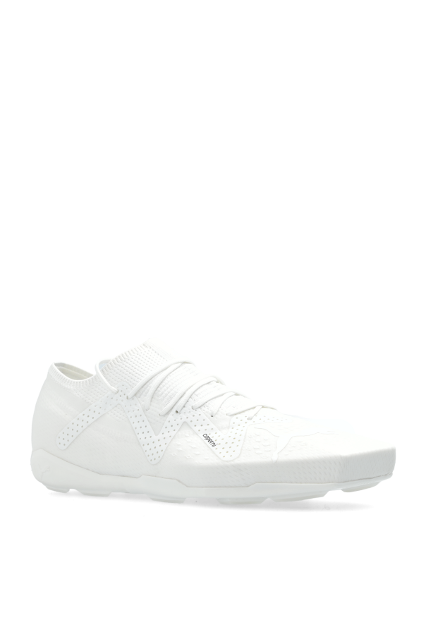 Introducing the pinnacle of modern footwear elegance: the Coperni x Puma sports shoe. This pristine white silhouette, part of an exclusive collaboration between the avant-garde fashion house Coperni and the iconic sportswear brand Puma, redefines athletic chic. With its low profile and rounded toe finish, this shoe offers a sleek, minimalist aesthetic that is effortlessly versatile. The upper is adorned with a distinctive pattern of breathable perforations, ensuring both style and functionality blend seamlessly. The minimal branding, featuring the subtle placement of the Puma logo and Coperni name on the heel, enhances its sophisticated allure. Crafted with lightweight materials and equipped with elastic straps in lieu of traditional laces, these shoes promise ease of wear without sacrificing comfort. The flat sole, made of high-grip rubber, underscores its practicality for both sportive endeavors and daily wear. The dominant white hue lends a clean and universal appeal, making it a stellar choice for an array of ensembles. Whether showcased on its own or as part of a complete outfit on a model, the Coperni x Puma shoe emerges as a beacon of contemporary and versatile fashion. Why Purchase This Product? Exclusive Collaboration: A unique partnership between Coperni and Puma, offering a rare piece for collectors and fashion aficionados alike. Unparalleled Comfort: Lightweight construction with elastic straps and a breathable design ensures all-day comfort. Versatile Design: The clean, white aesthetic and minimal branding allow for endless styling possibilities, from athletic wear to casual chic. High Quality Materials: Crafted with durable outer and inner material layers, and a rubber sole for superior traction.
