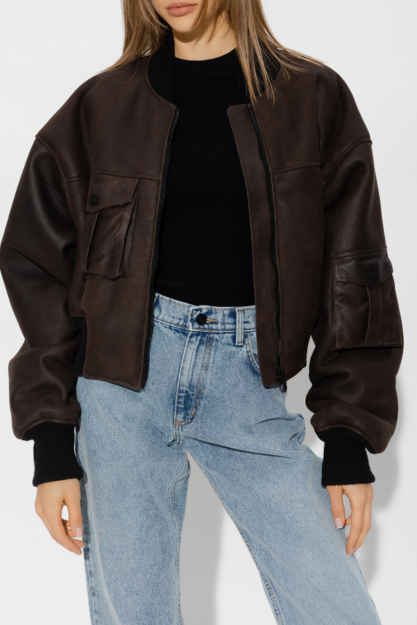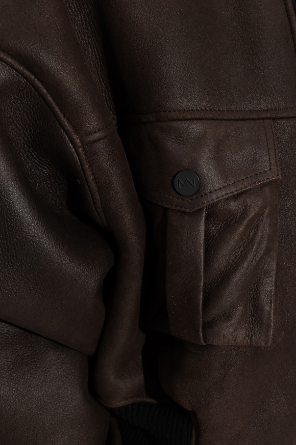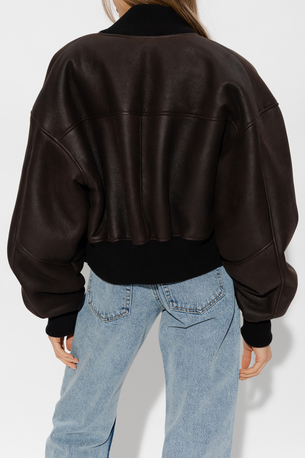Brown ‘Le Mans’ bomber jacket from The Mannei. Made of sheep leather, this style features an oversize fit, a zip fastening, two flapped pockets with snaps and black rib-knit trims on the collar, bottom hem and cuffs.