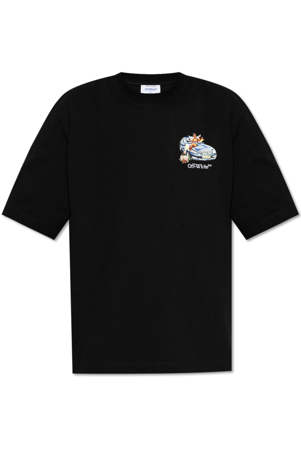 Introducing the Off-White™ T-shirt with Logo, a quintessential piece from the exclusive collection of the illustrious Off-White brand. Cloaked in a timeless black hue, this T-shirt epitomizes modern sophistication with its avant-garde design. The front of the T-shirt showcases a captivating colorful print of an angel perched atop a vehicle, accompanied by the iconic \"Off-White™\" logo. The back reveals a more intricate tapestry of angelic motifs, vehicles, and other decorative elements, making this piece a true work of art. Crafted from premium cotton, it offers a classic fit with short sleeves and a round neckline, ensuring both comfort and style. This T-shirt is a testament to Off-White\'s distinctive aesthetic, appealing to those who eschew conventional paths in favor of bold self-expression. Why Choose This Product? Exclusive Design: Unique prints that make a statement. Premium Material: Made from high-quality cotton for ultimate comfort. Iconic Branding: Features the renowned \"Off-White™\" logo. Versatile Style: Complements any modern wardrobe.