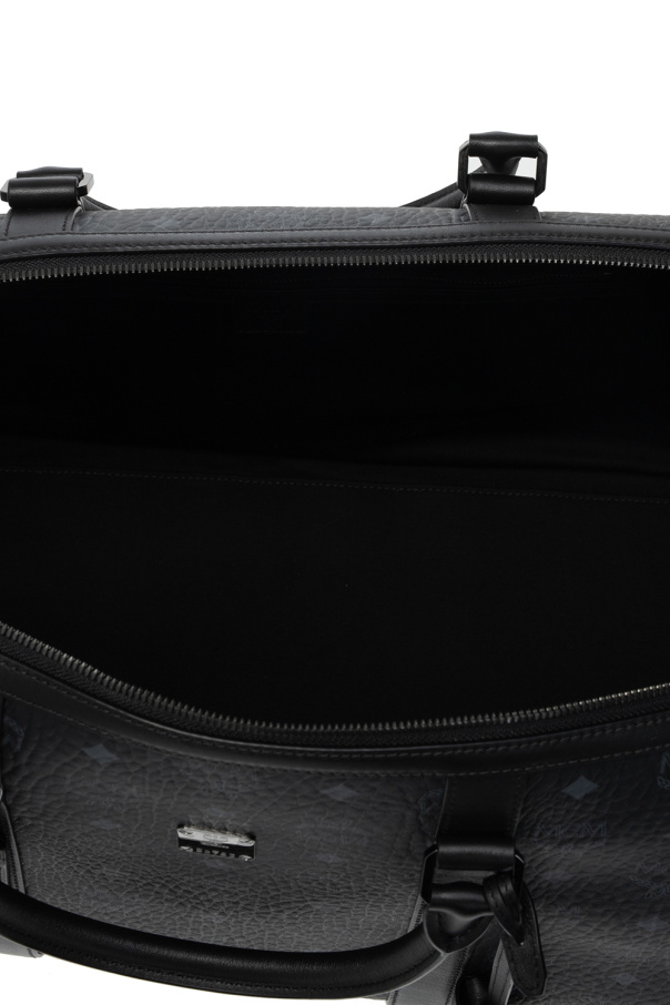 Introducing the Handbag with Logo from the exclusive collection by MCM, a celebrated German brand renowned for its exquisite leather goods. This splendid handbag, meticulously crafted from premium-quality leather and canvas, exudes an aura of sophistication and avant-garde elegance. The bag boasts a classic rectangular silhouette with gracefully rounded edges, complemented by two semi-circular handles and a detachable, adjustable shoulder strap. The exterior features a subtle, dark pattern of \"MCM\" letters and distinctive graphic elements, set against a deep, rich shade of black. Adorned with a metallic designer plaque, this accessory encapsulates luxury. Its main compartment, secured with a sturdy zipper, provides ample space for personal belongings, making it a perfect companion for travel. Embellished with gold-toned metal accents and accompanied by two chic charms, including one with a padlock, this handbag is a testament to refined craftsmanship and practicality. Why Purchase This Product? Timeless design with exquisite detailing Crafted from luxurious materials for durability Spacious interior with multiple compartments Versatile carrying options with detachable strap Iconic MCM branding for a touch of elegance