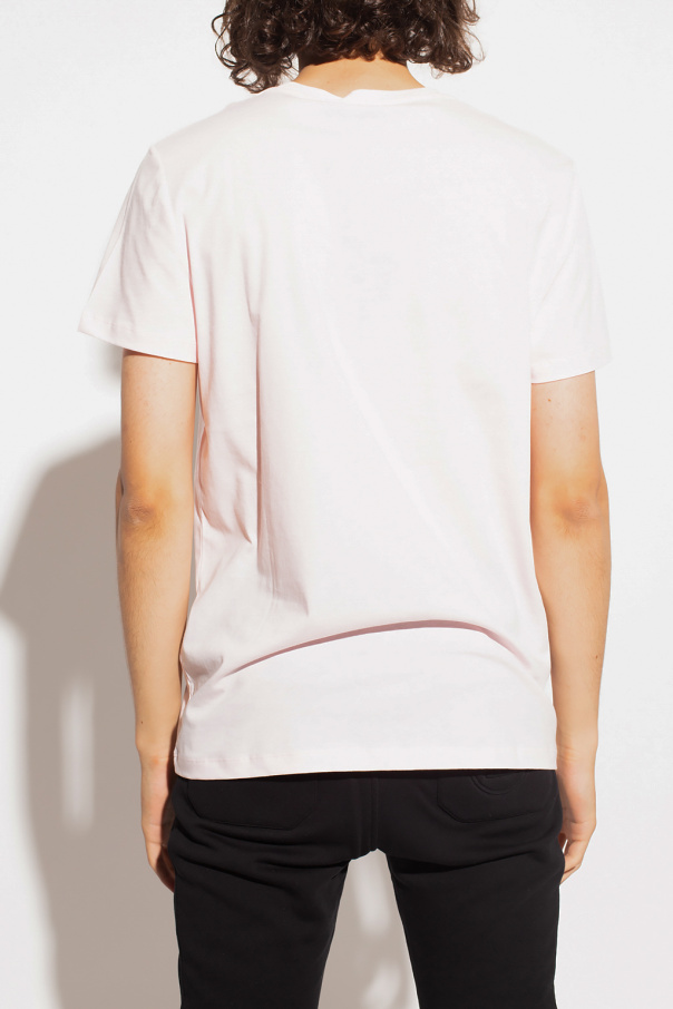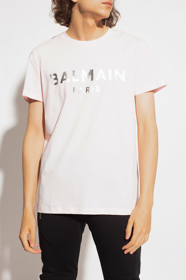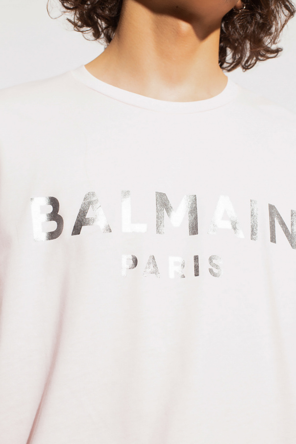 Light grey crewneck T-shirt from Balmain. Crafted from cotton, this garment is enriched by a silver-tone logo print and ribbed trims.