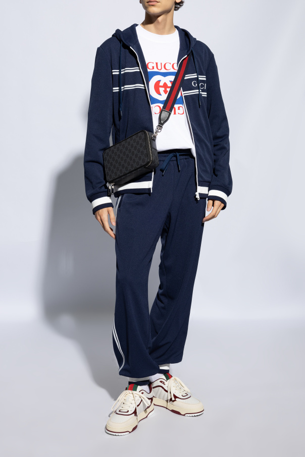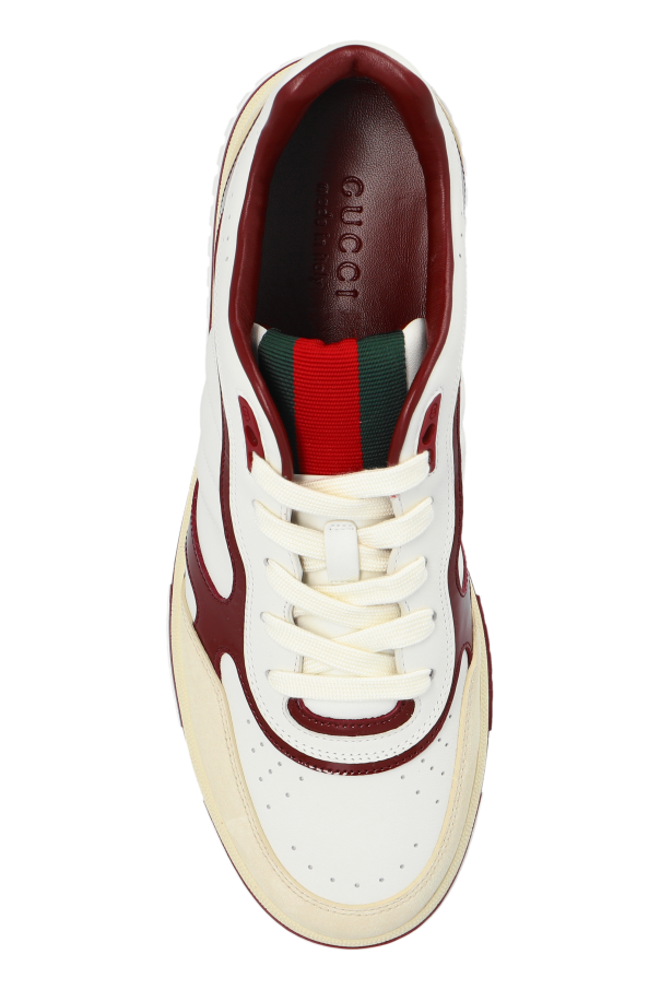 Introducing a remarkable fusion of vintage allure and contemporary craftsmanship, the Sporty Logo Sneakers by Gucci are a testament to timeless style and modern functionality. These sneakers boast a distinctive color palette that harmonizes shades of white, cream, and burgundy, evoking the nostalgic charm of the 80s and 90s. Crafted with meticulous attention to detail, the outer layer of these opulent sneakers is composed of 100% genuine leather, offering unparalleled durability and elegance. The interior layer, also fashioned from 100% leather, ensures a plush, comfortable fit, making these sneakers as cozy as they are stylish. The robust 100% rubber sole features a pronounced tread pattern for exceptional grip and stability, complemented by a cream hue that adds to the sneakers\' unique aesthetic. The design is accentuated by wide, leather panels in white and burgundy, creating a striking contrast, while the perforations near the toe serve a dual purpose of ventilation and visual appeal. The sneakers are adorned with the iconic logo on the side, signaling the exquisite craftsmanship synonymous with Gucci. The padded tongue and ankle area promise optimal comfort, and the vibrant green and red lining pays homage to the brand\'s heritage. Why Purchase This Product? Elegant Retro Design: A nod to the 80s and 90s fashion with a modern twist. Luxurious Materials: 100% genuine leather construction for both exterior and interior. Solid Support: Durable, 100% rubber sole with a unique tread pattern. Signature Gucci Appeal: Exclusive logo detailing and brand-specific color lining. Versatile Style: Effortlessly complements both casual and sophisticated attire.