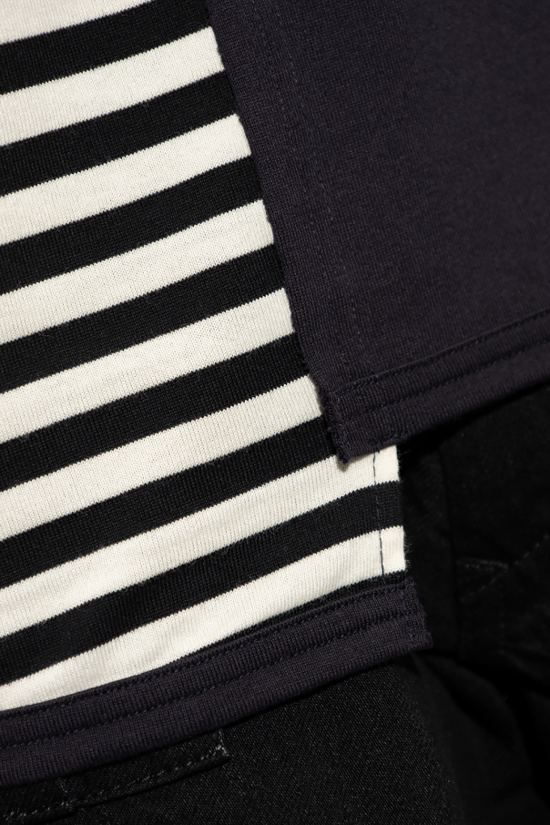 Navy blue and white crewneck T-shirt from Yohji Yamamoto. Crafted from cotton with an asymmetrical construction, this style features short sleeves, an elasticated collar and a stripe pattern on the side.