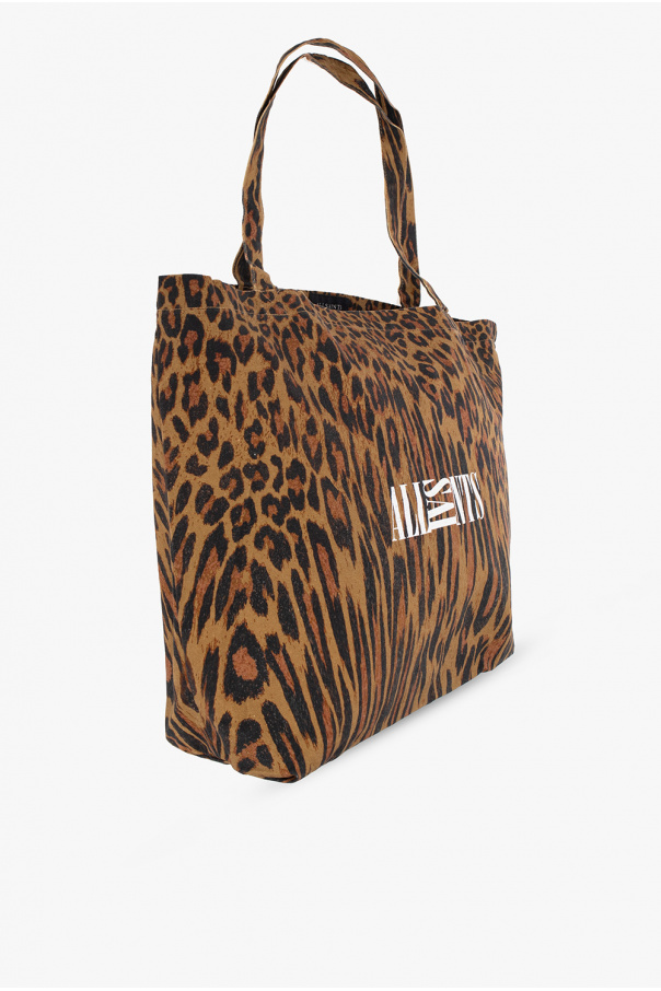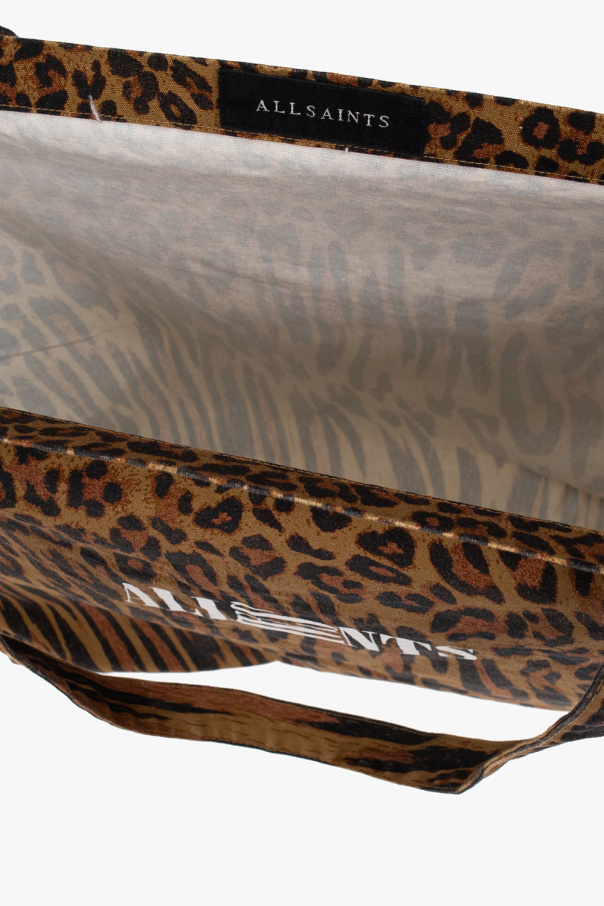 Brown and black ‘Oppose’ shopper bag from AllSaints. Decorated with an animal pattern and white logo print, this model has two half-round handles and one internal compartment.