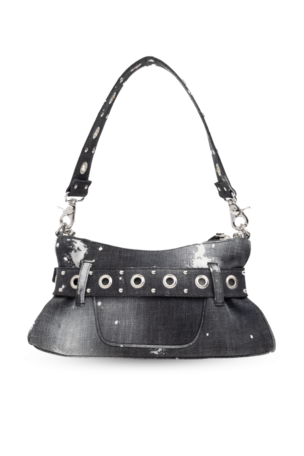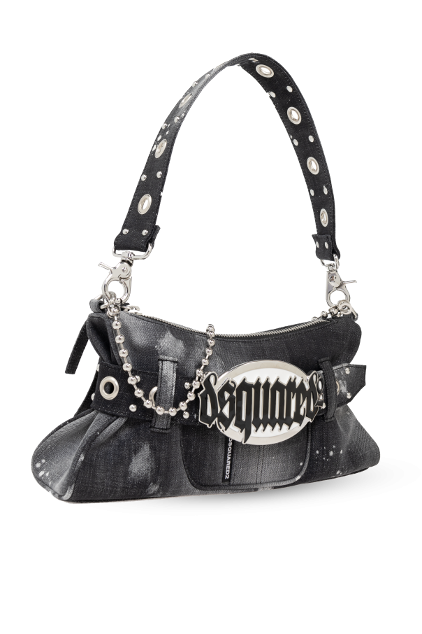 Introducing the epitome of urban sophistication - the Dsquared2 Shoulder Bag. Crafted with a discerning eye for detail, this exquisite piece manifests casual elegance with its unique denim fabric, artfully accentuated by lighter distress marks for an effortlessly stylish appeal. The bag\'s silhouette is a harmonious blend of gentle curves and a flat base, crowned by a delicately undulating top edge that exudes a soft, feminine charm. At the forefront, a large metallic logo emblem serves as a striking declaration of the designer\'s identity, styled with intricate incisions to create a captivating three-dimensional effect. Enhanced with metallic elements like chain links and riveted straps, this shoulder bag asserts a bold, edgy character. The adjustable shoulder straps offer customized comfort, while the detachable chains, affixed with carabiners, suggest versatility in styling. Its interior, lined with a smooth, uniform fabric, features a secure zip closure, a main compartment, and a slip pocket, ensuring both safety and organization. Why Purchase This Product? Exclusive Dsquared2 design, merging casual flair with urban edginess. High-quality denim construction with a hint of elastane for durability and comfort. Striking metallic logo and hardware details for a distinctive, recognizable look. Functional features including adjustable straps and a practical interior layout.