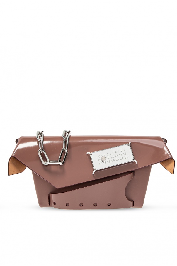 Pink ‘Snatched’ shoulder bag from Maison Margiela. Fastened with a snap, this style features a logo appliqué, chain shoulder strap, silver-tone metal hardware, beige suede lining and one internal compartment with one slip pocket.