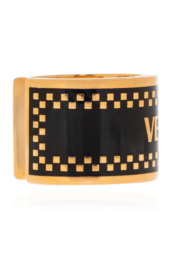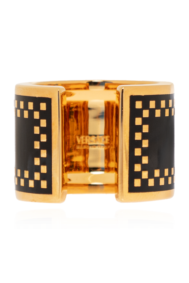 Introducing the epitome of luxury and modern design - the Versace Gold Logo Ring. This exquisite piece is a testament to the unparalleled craftsmanship and bold aesthetic synonymous with the Versace brand. Crafted from high-quality metal, the ring boasts a gleaming golden hue that exudes richness and exclusivity. The band\'s broad silhouette is adorned with a distinctive grid pattern, featuring golden rectangular blocks set against a striking black background. This design not only adds depth and texture but also enhances the ring\'s visual appeal, making it a standout accessory. At the forefront, the large, engraved Versace logo is prominently displayed on a black canvas, offering a stark contrast and underscoring the brand\'s iconic status. Made from 100% metal, presumably brass, its lustrous surface reflects the light beautifully, capturing the attention of all who behold it. The modern and daring design aligns perfectly with high-fashion trends, ensuring that this ring is not just a piece of jewelry but a statement. Why Purchase This Product? Exclusive Design: Features a unique grid pattern and a prominently engraved Versace logo, setting it apart from conventional jewelry. Luxurious Appeal: The golden hue and high-quality metal construction lend it an air of sophistication and opulence. Brand Prestige: Owning a piece from Versace, a brand renowned for its influence in the fashion industry, adds a significant cachet to your personal collection. Versatile Display: Whether showcased on its own or worn as part of a sophisticated ensemble, this ring makes a bold statement.