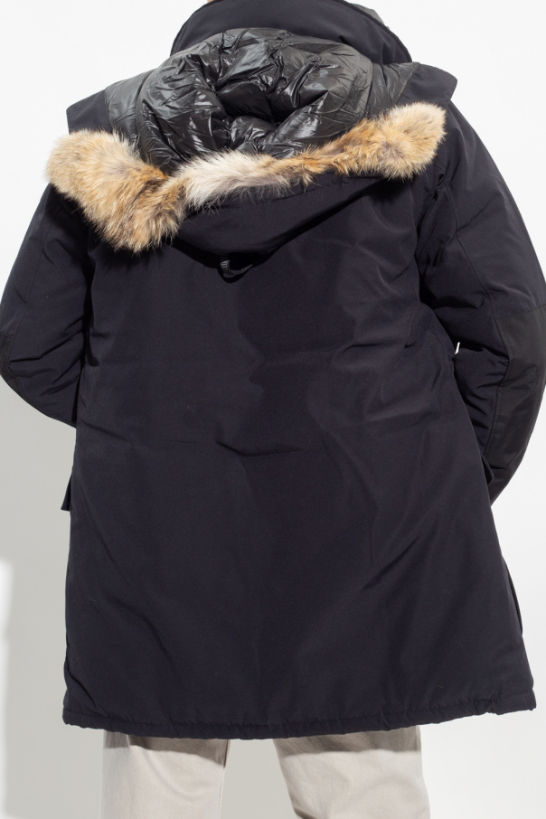 Navy blue and black ’Sherridon’ jacket from Canada Goose. Packed with duck down, this style secures with a two-way zip and snaps and features a drawcord-adjustable hood with a detachable beige and black coyote fur insert, multiple pockets, a branded sleeve patch, long sleeves with elasticated cuffs and thumbholes, and internal straps which allow the item to be carried hands-free over the shoulders.