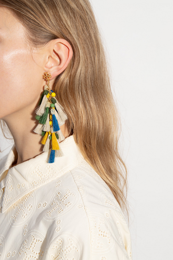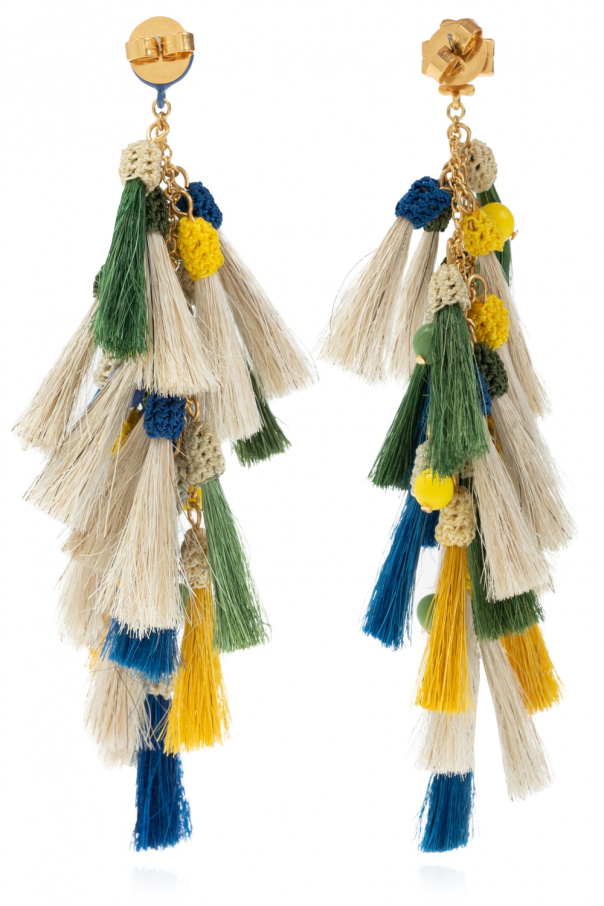 Navy blue and gold-tone earrings from Tory Burch. Made in brass, they secure with a stud fastener and showcase colourful horsehair fringes.