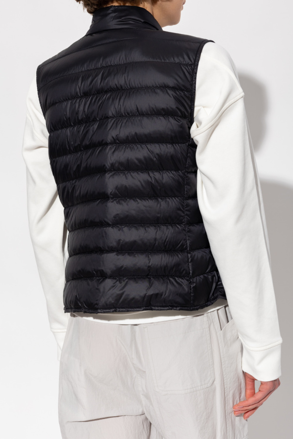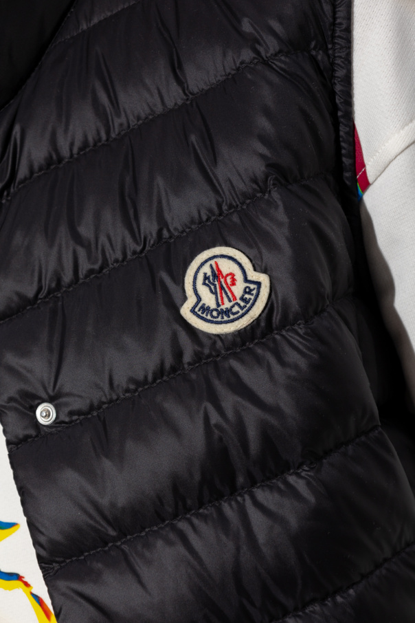 Black quilted vest from Moncler. Fastened with snap buttons, this design features a logo patch and two pockets with concealed zips.
