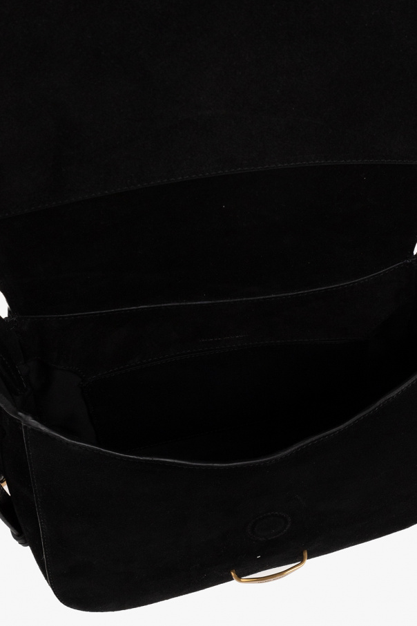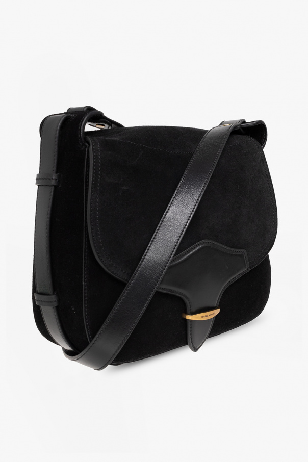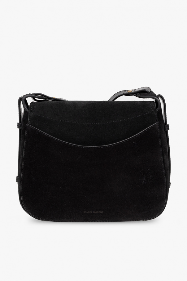 Black ‘Botsy’ shoulder bag from Isabel Marant. Crafted from calf suede with leather trims, this model features a magnetic closure with a metal logo-engraved appliqué, back pocket, adjustable shoulder strap, antique gold-tone metal hardware and one internal compartment with one slip pocket.