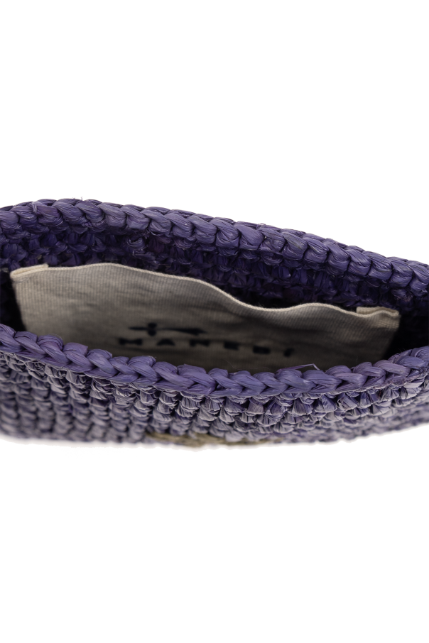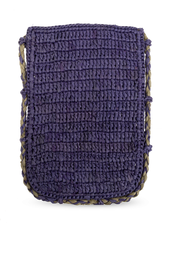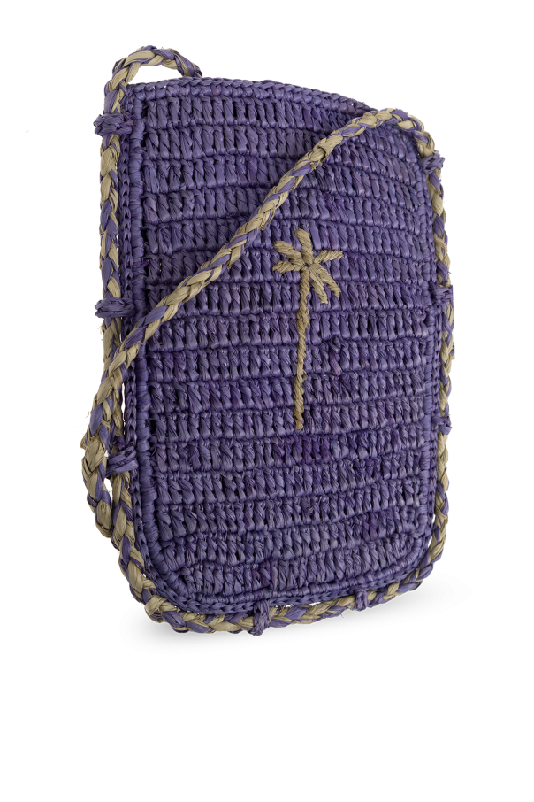Purple phone holder on a strap from Manebi. Hand-woven from natural raffia by local women from Madagascar, this design showcases an embroidered green logo on the front, one internal compartment and a long shoulder strap. *Due to the artisanal nature of the product, individual pieces may vary slightly.