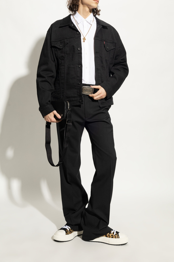 Beige and black ‘Berlin’ high-top sneakers from Dsquared2. Made of leather and fabric, this lace-up pair features an animal pattern, logo patch and white rubber sole.