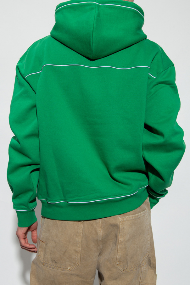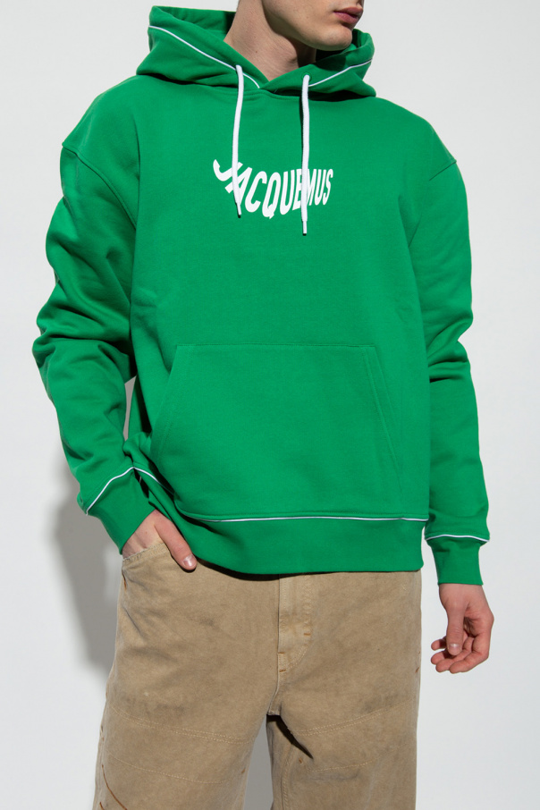 Green hoodie from Jacquemus. Made of organic cotton, this garment features a printed logo pattern in white, drawstring hood, slip pocket and ribbed trims at the hem and cuffs.