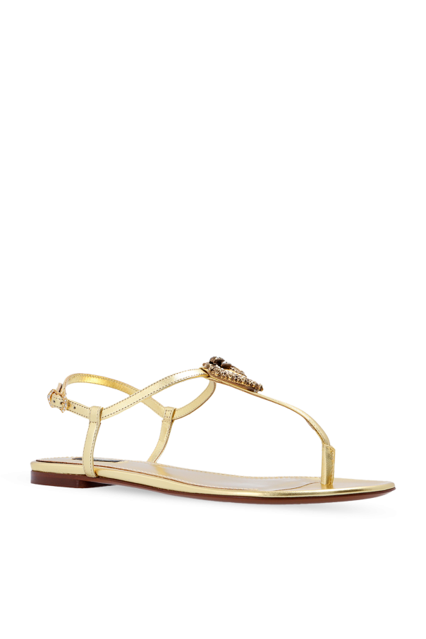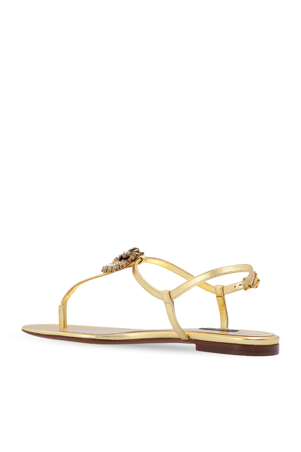 Gold-tone sandals from Dolce & Gabbana. Made of leather, this model features a decorative buckled ankle strap, metal Devotion appliqué and a brown leather sole.