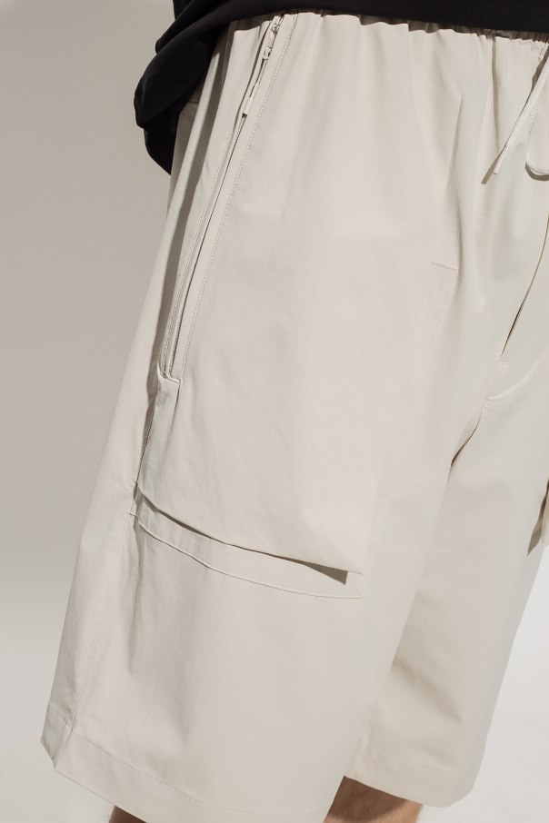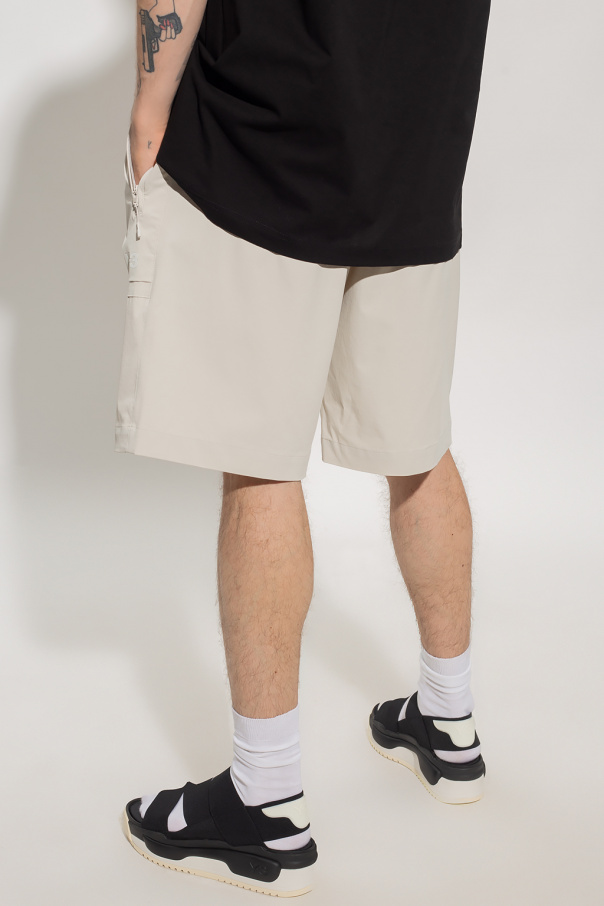 Greyish-cream shorts from Y-3 Yohji Yamamoto. Enriched by a logo graphic, this pair features a drawstring waistband, a zip fly with a button, three zip pockets and one slip pocket.