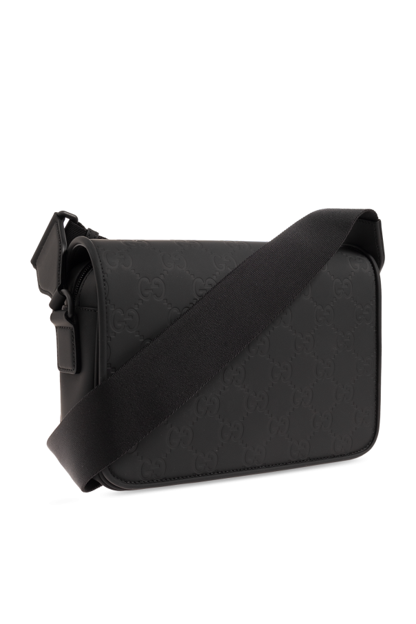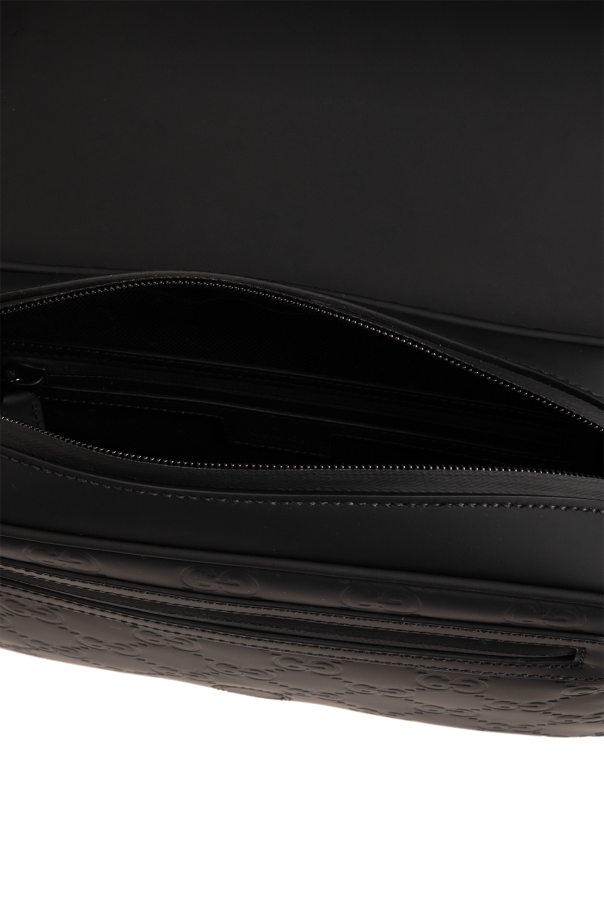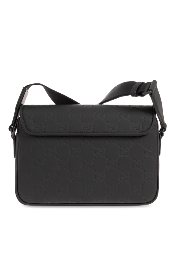 Black shoulder bag from Gucci. Made of calf leather with rubber coating, this model is complete with a magnetic snap, embossed logo, adjustable shoulder strap and one internal compartment with two zip pockets.