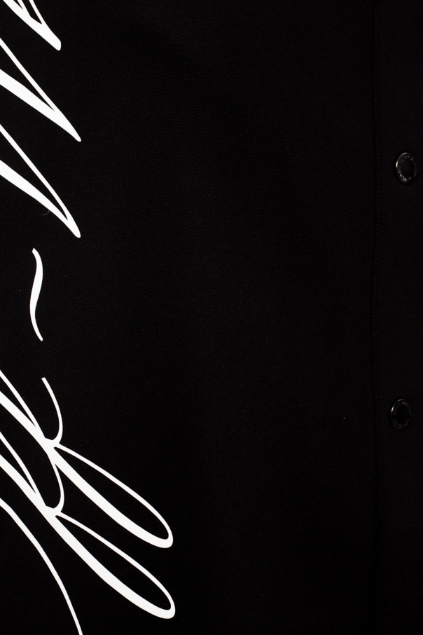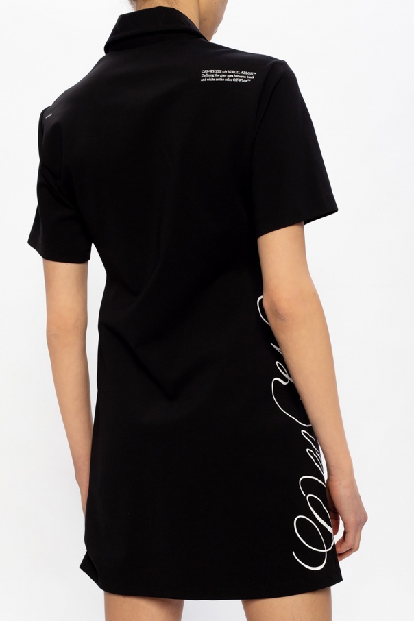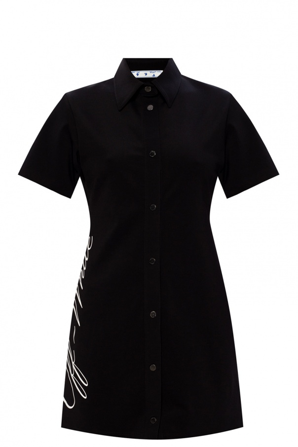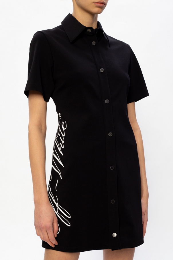Black collared dress from Off-White. Illustrated with a white print with the brand\'s logo, this short-sleeved style fastens via snap-buttons.