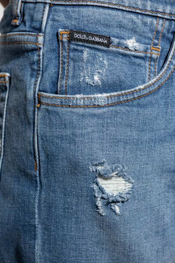 Blue jeans from Dolce & Gabbana. Crafted from cotton with a vintage effect, this pair falls with slightly tapered legs and features a zip fly with a button, classic five pockets and a logo-engraved patch at the back.