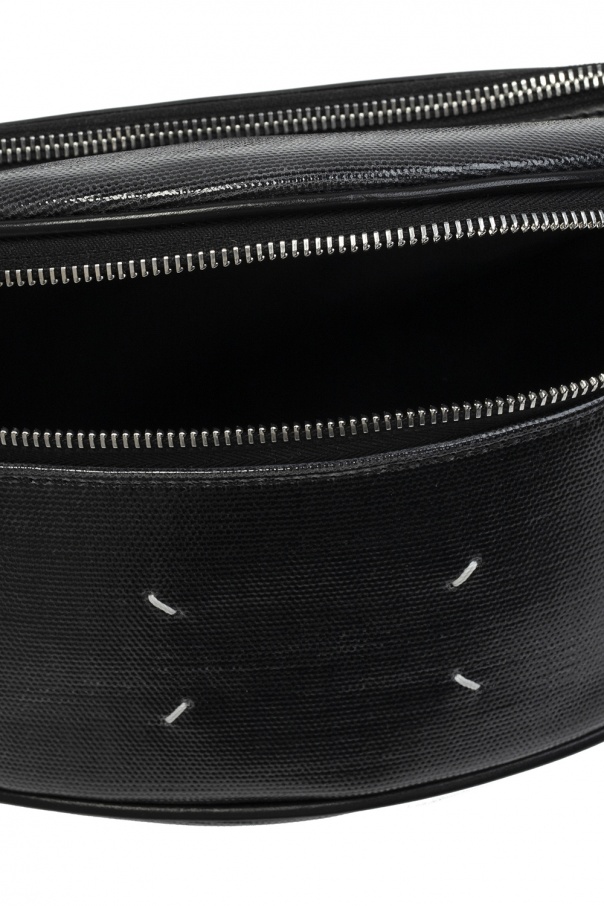 Black belt bag from Maison Margiela. Embroidered with the brand\'s logo in white, this item fastens via a two-way zip and features an adjustable strap, silver-tone metal hardware, leather inserts and one internal compartment.