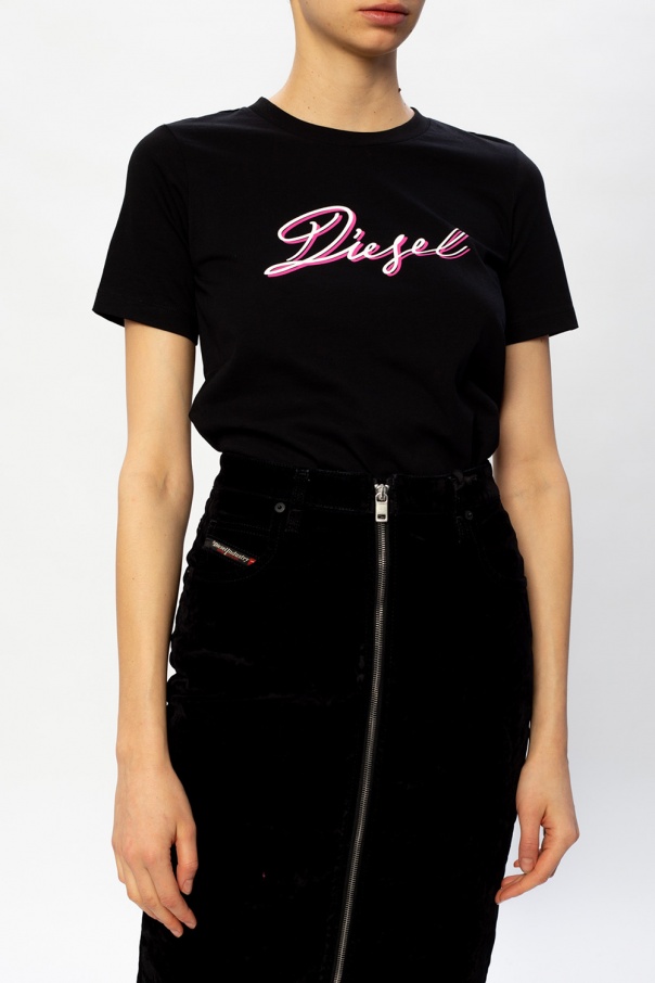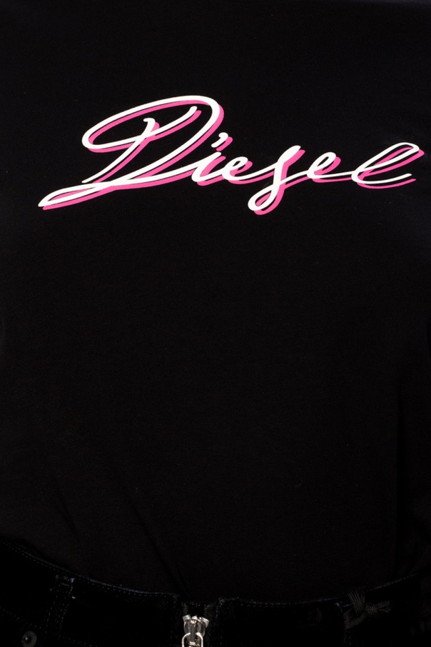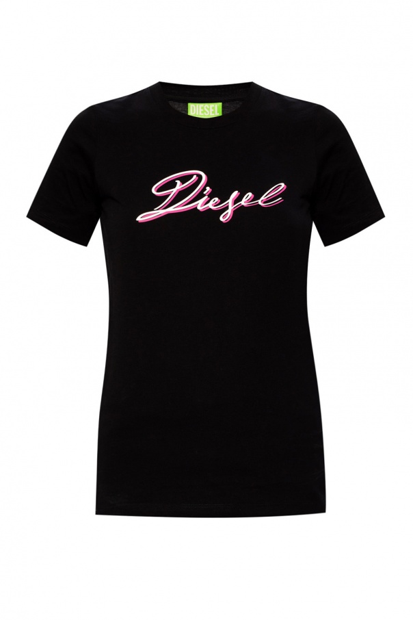 Black crewneck T-shirt from Diesel. Cut from cotton with a regular fit, this style showcases a pink and white graphic print with the brand\'s logo across the front.
