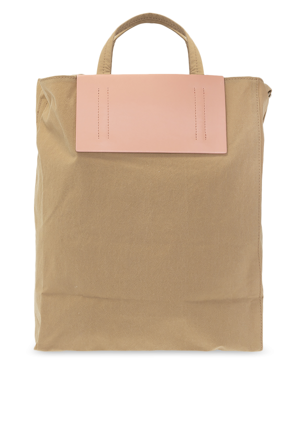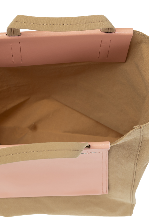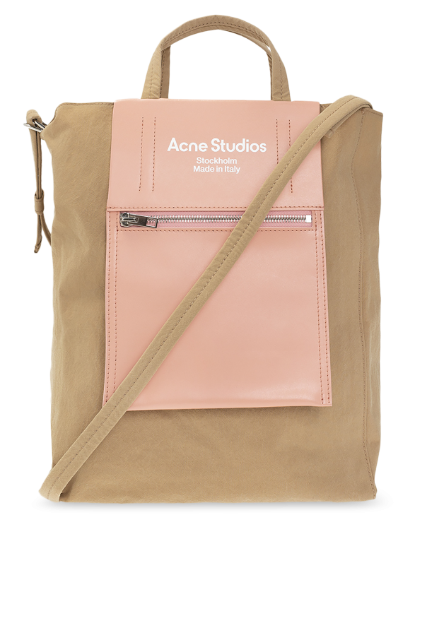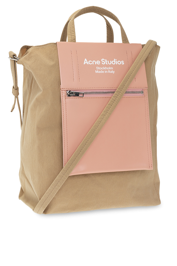 Light brown and light pink ‘Baker Out Medium’ shopper bag from Acne Studios. Trimmed with calf leather, this design features a white logo print, front zip pocket, two half-round handles and one internal compartment as well as a detachable and adjustable shoulder strap.