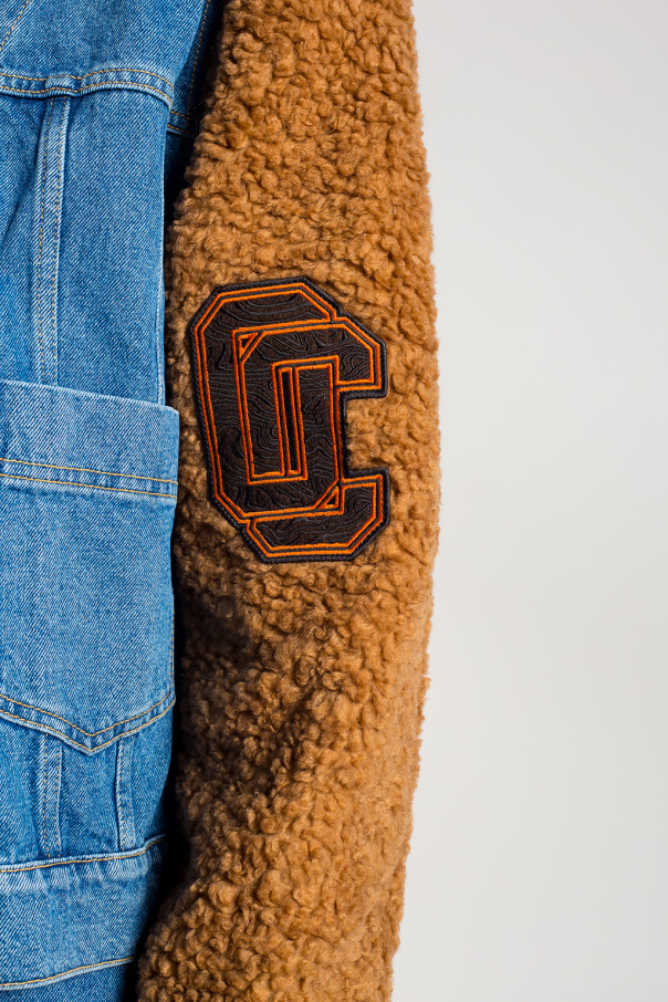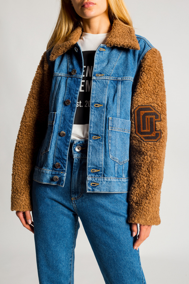 Blue and brown denim jacket from Opening Ceremony. Fastened with buttons, this design features two front pockets, stitching details, logo patch on the sleeve, ribbed hem and faux fur trims at the collar and cuffs.