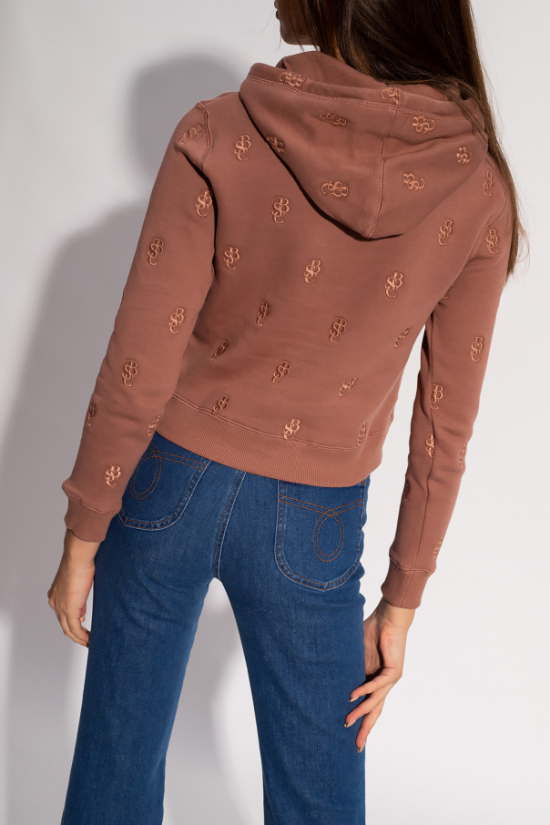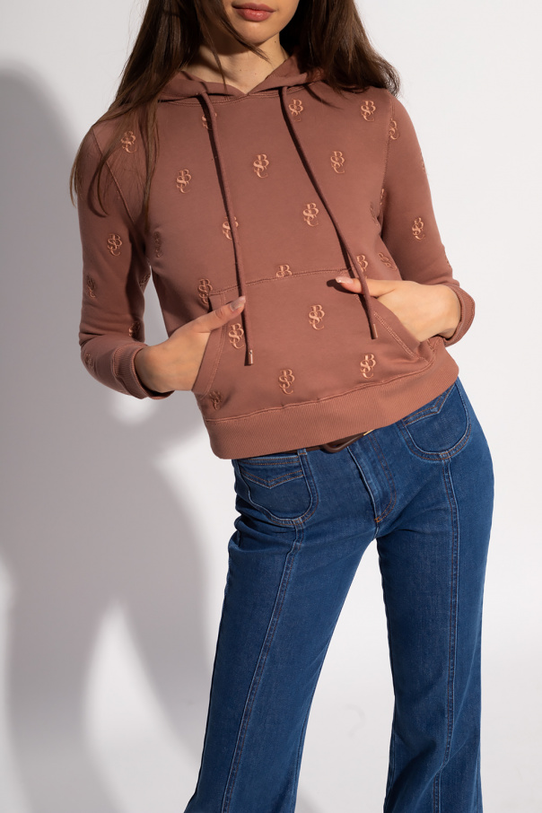 Brown and pink sweatshirt with a drawstring hood from See By Chloé. Crafted from cotton jersey, this hoodie showcases an embroidered logo, a kangaroo pocket and a ribbed bottom hem and cuffs.