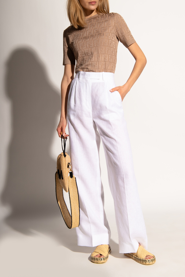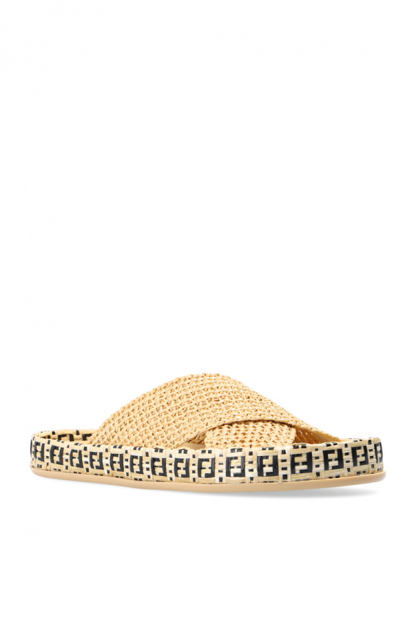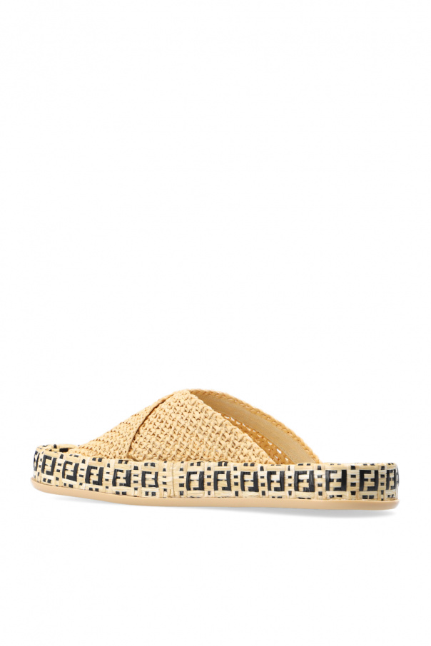 Beige and black woven slides from Fendi. Decorated with a logo, this pair is set on a beige rubber sole.