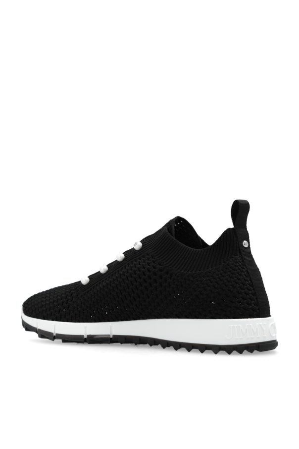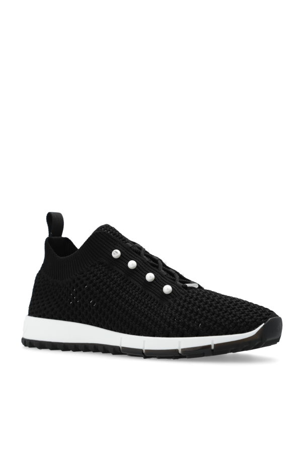 Black ‘Veles’ sneakers from Jimmy Choo. Made of fabric, this lace-up model sits on a black and white rubber sole and showcases a silver-tone application with an engraved logo and decorative pearl buttons.
