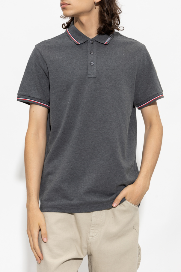 Grey polo shirt from Moncler. Crafted from cotton, this style features a collar with a button placket, short sleeves, an embroidered logo, a logo patch and the brand\'s signature navy blue, white and red stripe details.