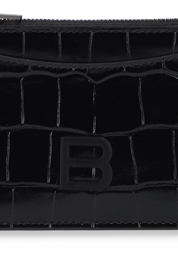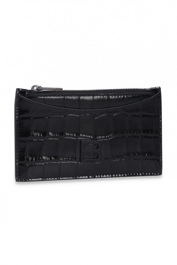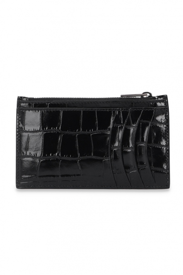 Black card case from Balenciaga. Crafted from patent calf leather with a crocodile skin effect, this item showcases a black metal logo plaque, two slip pockets, one zip pocket and four card slots.