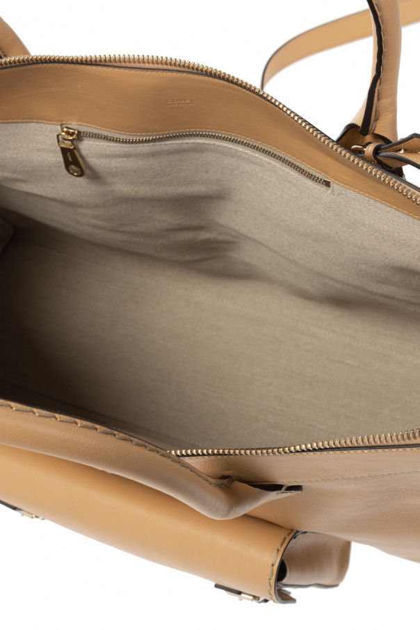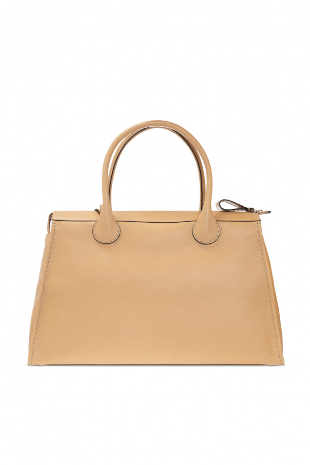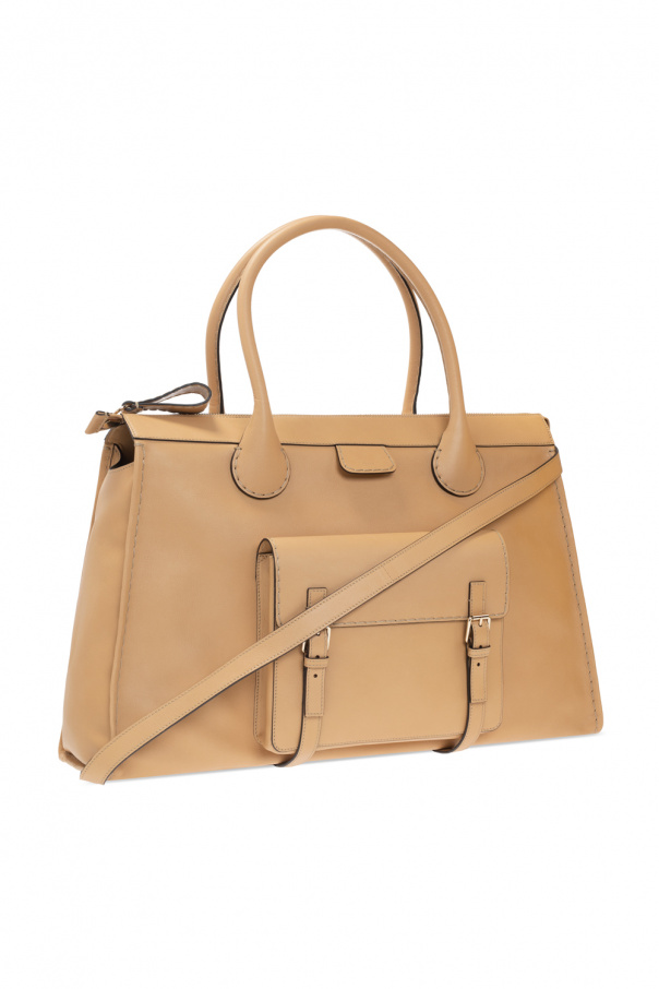 Cream and beige ‘Edith’ duffel bag from Chloé. Made of buffalo leather, this design features a zip fastening, exposed stitching, an embossed logo, one slip pocket and one pocket with buckle straps on the front, two half-round handles, a detachable shoulder strap, silver-tone metal hardware and a beige-clad interior with one compartment, one slip pocket and one zipped pocket.