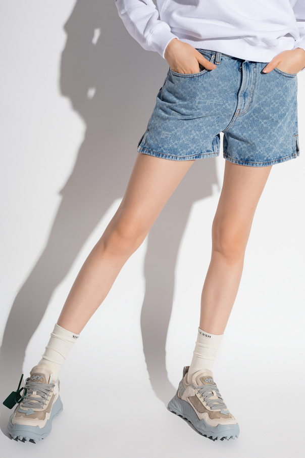 Blue denim shorts from Off-White. Fastened with logo buttons and a zip with a safety pin, this pair features a monogram pattern, leather logo patch at the back, three front pockets and two back pockets.