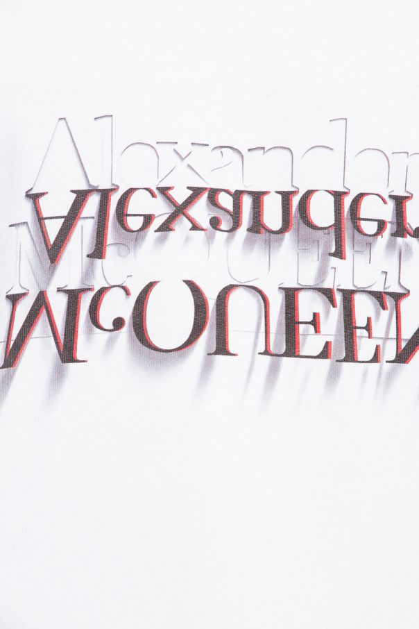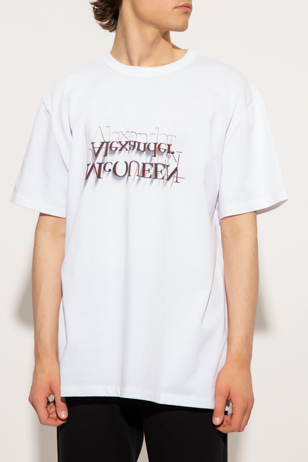 White crewneck T-shirt from Alexander McQueen. Made from cotton, this style features short sleeves, an elasticated collar, a red and black graphic print with a reverse logo motif on the front.