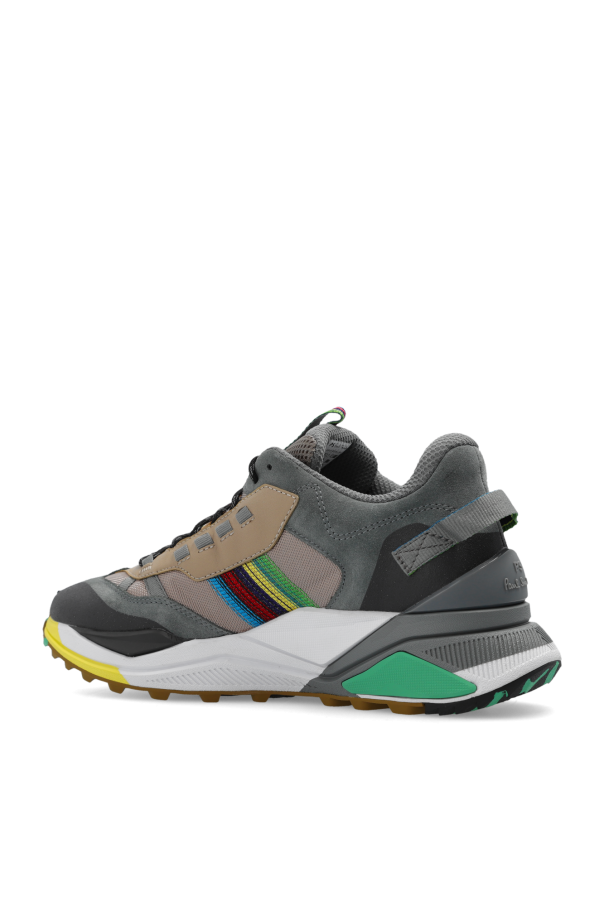 Multicoloured ‘Primus’ sneakers from PS Paul Smith. Crafted from suede and fabric overlays, this lace-up model sits on a colourful rubber sole and showcases the brand\'s logo.